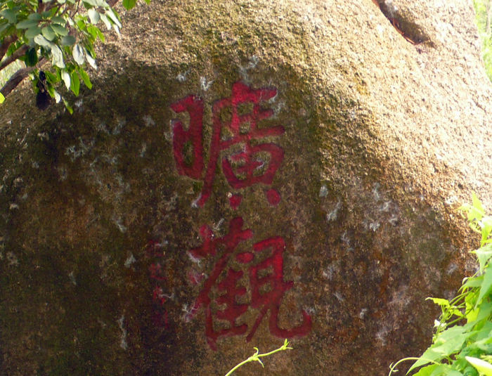登上崖頂"石溪"巖石右側(cè)一圓石刻著"曠觀"兩字。南眺遠(yuǎn)山如黛,玉盤一樣的香洲區(qū)盡收眼底。當(dāng)年名士多聚于此,豪飲放歌賦詩懷古,留下累累筆墨石刻,因年代久遠(yuǎn),現(xiàn)存僅三十余處。石溪摩崖時(shí)刻群大多取意于環(huán)境、石貌、如"茂林修竹"、"樵徑"等游人至此,如臨一座書法展覽館,趣味橫生。