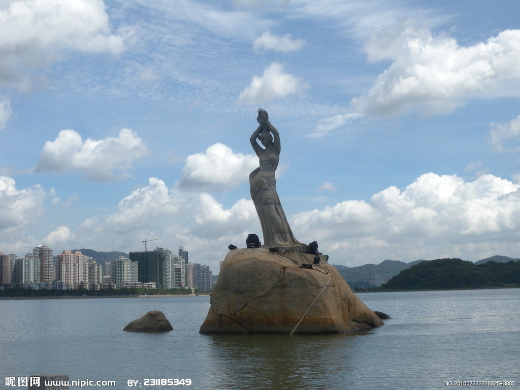 珠海漁女是珠海市的象征,位于珠海風(fēng)景秀麗的香爐灣畔,矗立著一尊巨型石刻雕像——珠海漁女,她領(lǐng)戴項珠,身掮漁網(wǎng),褲腳輕挽,雙手高高擎舉一顆晶瑩璀璨的珍珠,帶著喜悅而又含羞的神情,向世界昭示著光明,向人類奉獻珍寶。