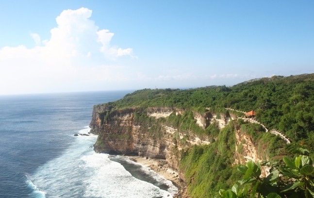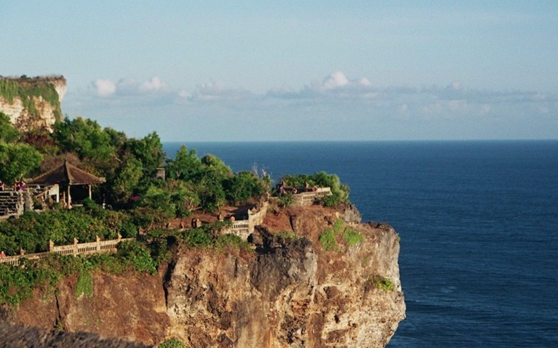 烏魯瓦圖斷崖位于巴厘島最南端。它的背后有一段凄美的愛情悲劇。傳說當(dāng)?shù)赜袑?duì)門戶不當(dāng)?shù)那嗄昴信鄳伲降母赣H是村長(zhǎng),因此兩人的愛情的不到任何祝福,在絕望之下雙雙投海殉情。為此地平添了離奇色彩。