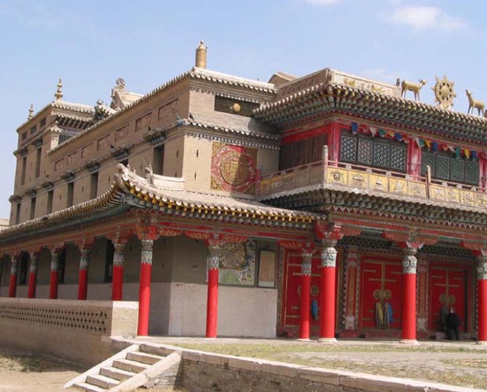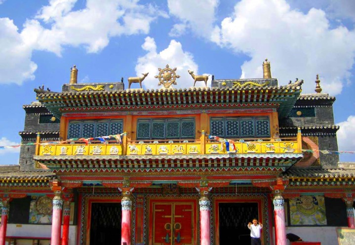 但那個時候,噶爾丹是朝廷的罪人,是不能大事鋪張的。所以,這個可憐的女人,就把噶爾丹的遺體簡單地埋葬在希拉穆仁河邊。這座墳墓,十有八九就是今天召河(希拉穆仁)鎮所在地西南一公里的王墓。版權所有山東聊城聊之旅國際旅行社有限公司,轉載必究!此是后話,按下不提。掩埋了丈夫的遺骨,帶著丈夫的遺孤,藍琪兒遠遠地離開了希拉穆仁,回到養育了她丈夫的故地,潛心撫育她心愛的兒子。康熙萬歲爺雖然消滅了噶爾丹,但對于藍琪兒的命運仍十分關注。也是命里注定,席力圖召的五世活佛圓寂了。六世活佛應該轉世在哪里?萬歲爺派遣密使,前往西藏,如此這般。不久,席力圖召大喇嘛得到旨意,到喀爾喀蒙古尋找,最后,找到了噶爾丹的遺孤、藍琪兒的兒子,將他命名為阿嘎旺老布生達瓦,成為席力圖召第六世活佛。以后的事情,正如您已經知道的,席力圖召六世活佛在希拉穆仁河畔建造了這座規模宏大的普會寺。普會寺的大門與王墓遙遙相望。他的目的,一方面是將其作為席力圖召的夏季避暑勝地;另一方面,則是為了讓他父親的亡靈,永遠得到佛教的護佑。