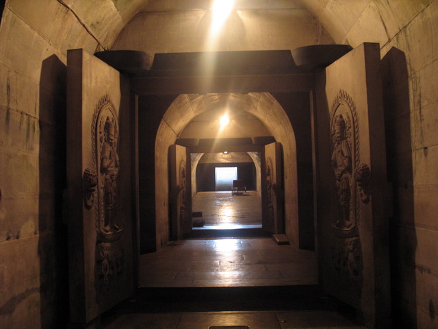 盡管清廷的遺臣為修建崇陵費(fèi)盡心思,光緒還是沒有能夠在他的地下寢宮里平安地長(zhǎng)眠下去。1931年軍閥混戰(zhàn)時(shí)期,一伙不明身份的兵匪盜掘了崇陵地宮,多數(shù)隨葬品被劫走。1980年6月,經(jīng)上級(jí)批準(zhǔn),清西陵文物管理處開啟地宮,清理整修,供國(guó)內(nèi)外游客參觀。這座地宮墓道全長(zhǎng)63.19米,是無梁無柱的石拱券式建筑,共有四道石門、九座券。門樓、門垛、門框、門簪均用青白石作原料,雕有瓦脊、瓦壟、花瓶等圖案,每道石門上都有巨大的銅鑄門管扇,八扇石門上分別雕有八大菩薩立像,金券內(nèi)有寶床,寶床正中有金井,光緒皇帝和隆裕皇后的棺槨停放在寶床上,棺槨周圍有用五彩繪制的龍山石16塊,寶床前東西各有石座兩個(gè),座上有香箱,是存放“冊(cè)”、“寶”用的。這座地宮雖已被盜,但仍出土珠寶玉翠等文物數(shù)百件。