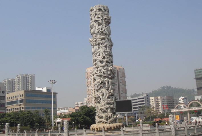 廣場分為三個區域:北端是集會區,以半圓形主席臺為標志,可舉行大型演出或舞會;中部是游覽區,建有大型白色花崗巖石雕九龍柱,高19.99米、直徑3米、雕刻浮度為60厘米,總重量為260噸,配置噴水池直徑28米,水池周邊采用花崗巖“二龍戲珠”浮雕扶欄,欄間嵌有8條1.99米高小龍柱。噴水由里向外形成落差,分段迭灑,錯落有序。