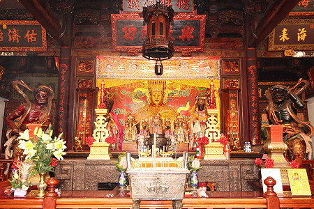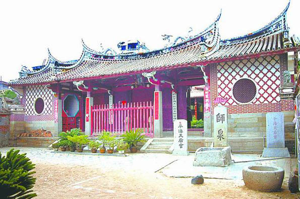 大天后宮為三進門式。由大門朝里望,透過三進逐次升高的天井和房舍狹長的空間,可以遙見那香煙繚繞、金黃帷幕下的全身媽祖神像。媽祖慈眉善目,神態安詳。據說媽祖原來是粉紅面,但經百年來受香火的薰繞,現在看到的媽祖已成了黑色的“香煙面”了。兩旁配祀千里眼、順風耳二將的泥雕,表情細膩,體態生動,古銅色的肌膚、一塊塊突起的肌肉,顯得極為兇猛威嚴,雕刻精細入微,栩栩版權所有聊城聊之旅國際旅行社有限公司,轉載必究!如生,實為雕刻精品。兩邊的神龕里還供奉著東、西、南、北四海龍王和水仙尊王。神奇古怪,嶙峋不凡,也都被煙薰成了黑臉。這些都是與海上的航海、救難有關的神。該廟還有一個特色就是除了正殿的媽祖稱為大媽外,還配有所謂的“二媽”、“三媽”的媽祖神像,造型僅為大媽的一半,臉色為粉紅色,兩眼張開,與媽祖神像眼瞼呈下垂狀不同。