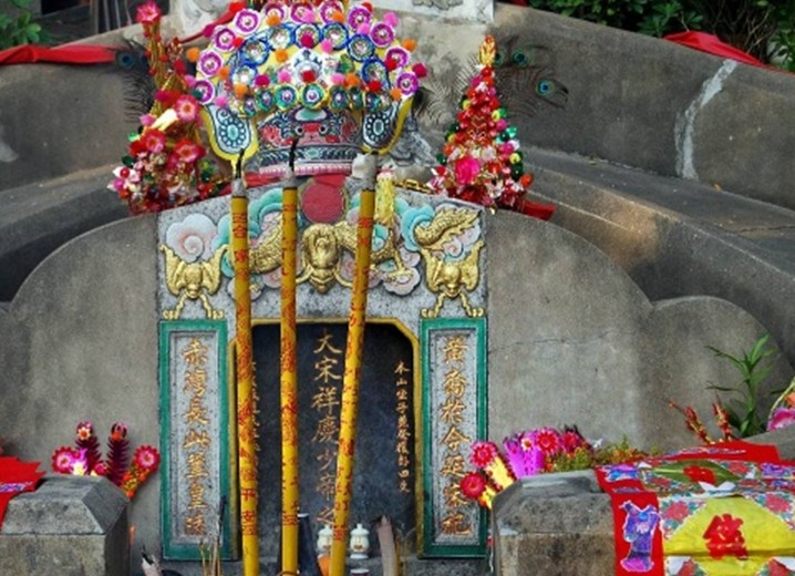 碑后為墳堆,有兩重弧形圍墻,前段中間頂面塑祥云拱月,涂染朱紅,后段頂面塑雙龍拱日,下有一只鳳鳥裝飾。墓的東側,立有一塊泉州白石碑,正面是《宋帝昺陵墓碑記》,記敘了宋少帝的生平、陸秀夫負帝殉海的經(jīng)過以及陵墓的修建情況,碑文為篆體陰文,風格古拙,是著名書法家商承祚所寫。石碑背面則刻有著名書法家秦萼生題筆的八個大字:“崖海潛龍,赤灣延帝”,字體蒼勁。陵墓西側,版權所有山東聊城聊之旅國際旅行社有限公司,轉載必究!是一座高約四米的陸秀夫負帝殉海石雕像,民族英雄陸秀夫背負幼主,視死如歸,凜然正氣,令人肅然。或許,正是陸秀夫這種寧死不屈的民族氣節(jié)的感召,不時還有世人前來拜祭。在少帝陵前,在陸秀夫像前,擺滿了豐盛祭品,縈繞著裊裊香煙……