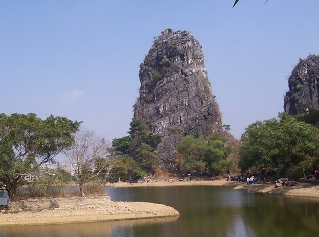 湖水中獨(dú)立一柱,風(fēng)光旖旎,湖畔繞疇,湖岸垂柳依依,“通天蠟燭”破水而出,直向藍(lán)天伸長,形如石山,仿如巨燭。用“拔地攀天起,一柱乾坤連”來形容其氣勢磅礴,恰如其分。峰聳湖畔,倒映湖中,花樹掩映,湖光山色,融為一幅秀麗非常的水墨山水畫。身歷其境,你會(huì)驚嘆造物主的鬼斧神工。每到春夏之交,滿山樹木的碧綠與湖邊楊柳暉映成趣,湖中泛舟垂釣,就象置身于桂林山水之中,令客留連忘返。