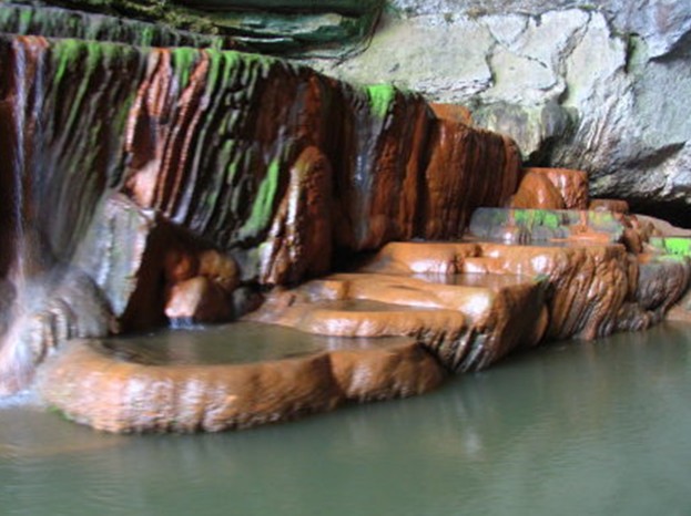 陽春玉溪三洞全長3公里,均可坐船瀏覽。第二洞長330米,水深2-5米,水面寬20-30米,河水清澈如玉,水中多生長鯉魚。洞中景物豐富,尤以“三變石”為趣,詩人張永枚曰:“遠(yuǎn)似漁翁釣清流, 近如獅子滾繡球,忽變犀牛望明月,一石三景迷輕舟”。第一洞頂?shù)?ldquo;皇冠”石,酷似皇冠,游人在船上隨即可拍攝一幅頭戴皇冠的照片。第一洞長400米,上面有一層旱洞,水面距洞頂高48米,該洞以“金盞疊泉”最為壯觀,一個(gè)個(gè)金黃色的石盞滿載清澈的泉水往下流。詩人韋丘贊道:“串玉溪穿三洞天,柔情碧水石能言,聲聲燕語留歸客,舉漿猶疑落漿難”。