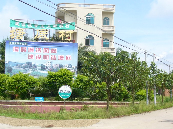 塘底村地處新民鎮(zhèn)西北部,全村現(xiàn)有人口1182人,耕地面積490畝,種果面積450畝,2005年實(shí)現(xiàn)人均純收入達(dá)3000多元。近年來(lái),該村致力把村容、村貌環(huán)境建設(shè)作為新時(shí)期農(nóng)村工作的首要任務(wù)來(lái)抓好,高標(biāo)準(zhǔn)、高起點(diǎn)建起了初具規(guī)模的生態(tài)文明新農(nóng)村。至2005年底止,全村共投資280多萬(wàn)無(wú),清除雜竹1200多叢,28000多根,清理雜屋80多間,1500多平方米,推土8000多立方米,填污水塘5個(gè),建設(shè)環(huán)村道5.8公里,建設(shè)文化樓一幢,燈光球場(chǎng)一個(gè),大舞臺(tái)一個(gè),種植大王椰108棵、蘇鐵106棵、黃金梅球88個(gè)、黃皮果苗1600株、草皮1000平方米,綠化面積達(dá)3900平方米,房屋門(mén)前硬底化面積3500平方米,從而使整個(gè)村莊的精神面貌煥然一新。該村在抓好生態(tài)文明村建設(shè)的同時(shí),著力抓好社會(huì)治安綜合治理和民主法制教育以及反腐倡廉教育,村中無(wú)打架、斗毆、吸毒、賭博,無(wú)重大刑事案件發(fā)生。近年來(lái),該村先后被授予廣東省文明村、廉江市生態(tài)文明村、無(wú)毒社區(qū)、安全文明小區(qū)和湛江市優(yōu)秀安全文明小區(qū)、湛江市民主法治示范村等光榮稱(chēng)號(hào),是省、市反腐倡廉教育進(jìn)農(nóng)村示范點(diǎn)。