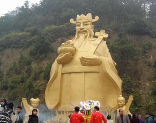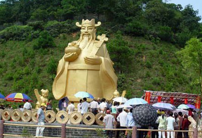 聚寶天地和君子園兩大部分:進入由金磚作墻、兩錠巨大金元寶托起一串金燦燦的古錢幣的景區大門,便是聚寶天地,走過九宮八卦飛星圖轉運壇。隔湖可見一尊全國最大的財神塑像,手捧聚寶盆向人們惠賜財運,轉身而望,兩塊寶錠與一座青山組成的天然巨大寶錠遙遙相對應,何其相似乃爾!環湖邊是一條由一個個金錢鋪就的丁財路。