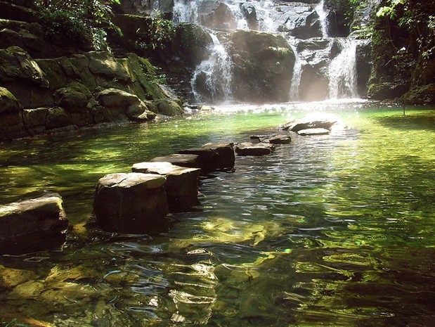 鼎湖山飛水潭,又名龍?zhí)讹w瀑,位于鼎湖山南半山腰、慶云古剎下東側(cè)。 去飛水潭,由榮睿碑亭拾級登山,沿曲徑云封直上,至半山腰向右拐,過眠綠亭即可。當(dāng)然,亦可在榮壑碑亭前面的山溪邊起步,一直溯溪而上。這里,山石嶙峋,瀑布從40多米高的崖頂深處狂奔而來,直往下飛瀉,忽而形成千尺飛流,如白練懸空,忽而濺作滿空雨花,如輕紗曼舞。瀑布下,如注的水流匯成一泓碧水,中有巨石,上刻“枕流”2字。