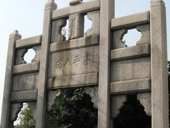 升平人瑞牌坊位于廣東省中山巿沙溪鎮(zhèn)圣獅村,建于清代宣統(tǒng)二年(1910年),為四柱三間通天式牌坊,用花崗石雕鑿構筑,高約6米。 坊上正面主間正中豎刻"圣旨"。主間橫匾陰刻:"升平人瑞"四字,上款:"宣統(tǒng)二年冬月",下款:"壽民阮維光立"。次間左右橫匾陰刻:"戩谷"、"延厘"。中柱對聯(lián)陰刻:"鶴算綿延大衍重圍徵篤?","龍章寵錫覃恩叨被慶遐齡"。背面主間正中豎刻"恩榮"。