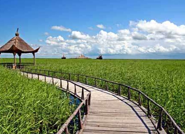 當奈濕地位于黑龍江省大慶市杜爾伯特蒙古族自治縣煙筒屯鎮境內,扎龍國家級自然保護區腹地,總面積57萬畝,據考證,是目前亞洲已知僅有的兩塊原生態濕地之一。現在仍然保持著完整的原始風貌,大小湖泊星羅棋布,生物類別多種多樣,這里有丹頂鶴、大雁、野鴨等珍貴鳥類200多種。每到夏季,藍天碧水,蘆葦蕩漾,群魚戲蓮,百鳥歡歌。由于地勢低平,小興安嶺流下來的烏裕爾河和雙陽河在這里滯留成湖,演變為大片濕地,總面積達3萬多公頃,濕地周圍水際生態系統交錯替代形成的半濕潤半干燥的環境最具代表性的景觀是大片草原和蘆葦沼澤,在數萬公頃浩浩蘆葦蕩中,葦林如海,水網如織,景象壯美,是黑龍江西部地區極具特色的旅游資源。版權所有山東聊城聊之旅國際旅行社有限公司,轉載必究!當奈一詞蒙古語謂“danghi ni ,蒙古語義是“仙女”或“女神”的稱謂。這個名字與古代杜爾伯特蒙古人母系文化崇拜有某種內在的聯系和延續。當奈曾經有座蒙古喇嘛廟名叫“syalugqsum”,漢名普教寺建于公元1696年(清康熙三十五年),在它之前此地有否女神廟或女性敖包一類祭祀類型構造物,當奈的普教寺興建有這樣一個歷史傳說。當奈屯附近的腰靈泡、花籃泡、納金泡葦蕩里春夏秋季節棲息著無數的野鴨、天鵝、仙鶴。有一年清康熙皇帝行獵到此,被一老者認出,驚動了周圍百姓,于是他們前來跪拜皇帝祈福,康熙大為感動,按百姓意愿賞銀建造喇嘛廟,并賜名普教寺,愿百姓吉祥。可惜這廟解放后被扒掉了,若存在該是308歲。當奈人居生態村規劃本著保護濕地原有特色、變消極保護為積極的開發式保護的原則,將生態村建設成為大慶濕地核心旅游區,我國濕地人地關系的標準景點和重要的濕地科研、科普教育基地。當奈村民風淳厚,民居古樸,農家特色飯菜遠近聞名。當奈菜系為農家菜系,有當地產的純天然的泥鰍魚、老頭魚、鯽魚、麥穗魚、柳根魚、嘎牙子以及珍貴的龍虱,還有自家產的茄子干、豆角干、干白菜等,主食有大餅子、包米碴子、小米飯等。是觀光、休閑、度假、科研的最好去處。幾年來,在大慶市和杜爾伯特縣委、縣政府的關懷支持下,本著“邊規劃、邊建設、邊規范”的原則,不斷整合旅游資源,加大投入力度,版權所有山東聊城聊之旅國際旅行社有限公司,轉載必究!強化了以基礎設施為重點的各方面建設。多方面累計籌集資金400余萬元,實施了包括景區大門、停車場、垂釣園、碼頭、仙鶴居、萬米百鳥園、千米葦海長廊、百米旅游商品購物長廊和鳥類表演區建設,同時引進武夷山竹排60余張,構建了蘆蕩撐排、湖中捕魚、鳥園觀鶴、長廊賞蓮、休閑購物、品農家特色等一系列旅游項目。每年都接待國內外游人3萬多人次,旅游業已成為拉動當地農民增加收入的骨干產業。