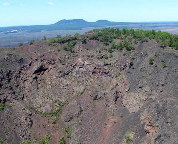 黑龍山南坡覆蓋的是火山礫,也稱火山灰。火山礫是氣體噴發的產物,當巖漿中氣體特別充沛時,就噴發出泡沫狀的熔巖,冷凝后,隨著風向散落在火山周圍。根據火山礫的分布情況,可以推測火山噴發時這里刮的是北風或西北風。山體由早、晚兩個火山錐體套疊而成,早期的錐體被晚期的噴發破壞并占據,從植被的疏密上可以看出早晚的差別,它是一座休眠活火山。