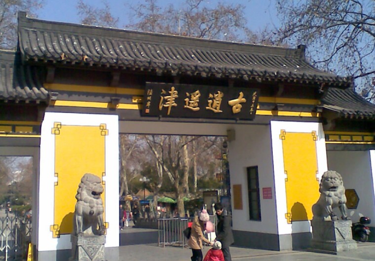 公園南大門是一座高近10米、三開間、牌樓式的仿古大門。大門上方一塊古色古香的牌匾上書“古逍遙津”四個(gè)鎏金大字,字為清狀元、宣統(tǒng)皇帝溥儀的老師陸潤庠手書。進(jìn)入公園,首先看到的是一尊持槍躍馬的張遼青銅塑像。塑像高達(dá)5米,底座上有“威震逍遙津”五個(gè)大字。