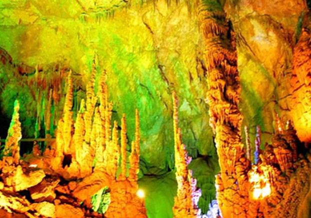 黃山歸來不看岳, 織金洞外無洞天, 瑯嫘勝地瑤池景, 如信天宮在人間。貴州屬于喀斯特巖溶地質地貌,故形成了山中有洞洞中有景的地理征,出現了石林、石溝、石牙、峰林、漏斗、天生橋、巖溶湖、瀑布等地表巖溶形態,又有溶洞、地下河、地下湖、鐘乳石、石柱、石筍、石幔等地下巖溶形態。從而組成了發育完整、類型多樣、造形奇特、宏偉瑰麗的巖溶洞穴系統。畢節織金洞便是這之中的姣姣者。織金洞又名打雞洞,位于織金縣境內。它由11個景區,47個廳堂,150多個景點組成一個天然洞穴美景。洞口是花園式的迎賓廳,千奇百異的花草點綴著"雙獅"、"玉蟾"、"飛來石"等石景,迎接著來自遠方的客人;正午時分,烈日當空,萬道金光從洞頂灑向織金洞,在水蒸氣的繚繞彌漫中彩環重現,陽光下的小水滴恰如一串串晶瑩而透明的珍珠散落人間,其境美不勝收,其意可幻可切。琳瑯滿目的鐘乳石,大的數十丈,小的如手掌,織金洞的銀雨樹,是一種罕見的花狀透明結晶體,從白玉似的托盤中沖天而起達17米,亭亭玉立、珠光寶氣;水晶宮又名雪香宮,宮內的鐘乳石表面皚皚石雪,頂頭冰柱高掛,地上石筍密布,幌如東海龍宮。