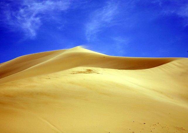 巴里坤鳴沙山位于新疆巴里坤哈薩克自治縣境內(nèi),西距縣城60公里,四周被豐美碧綠的草場所包圍,猶如湛藍大海中的一座金色小島。鳴沙山形似一朵蘑菇,高約百米,沙丘陡峭,其下有水泉,左右兩側(cè)有河流通過。據(jù)說這里是唐代女將樊梨花西征遇難的地方,聽到的沙鳴,就是女兵們當時擂鼓助陣和沖殺鼓掌之聲。