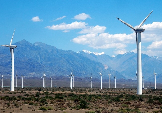 在烏魯木齊去吐魯番的途中,沿路南行,在通往絲路重鎮達坂城的道路兩旁,上百臺風力發電機擎天而立、迎風飛旋,與藍天、白云相襯,在博格達峰清奇峻秀的背景下,在廣袤的曠野之上,形成了一個蔚為壯觀的風車大世界。這里就是目前我國最大的風能基地——新疆達坂城風力發電廠。