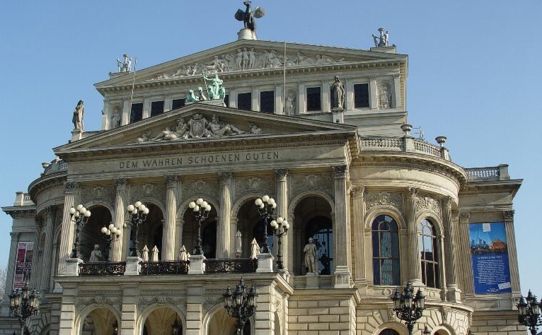開演當(dāng)年威廉一世皇帝觀看了首場演出之后,大為感動,宣布說唯有法蘭克福能繼承如此金碧輝煌,1945年戰(zhàn)爭以后它完全成為廢墟,七十年代末的修繕共花費了兩億四千萬馬克,新建采用新古典主義式。
