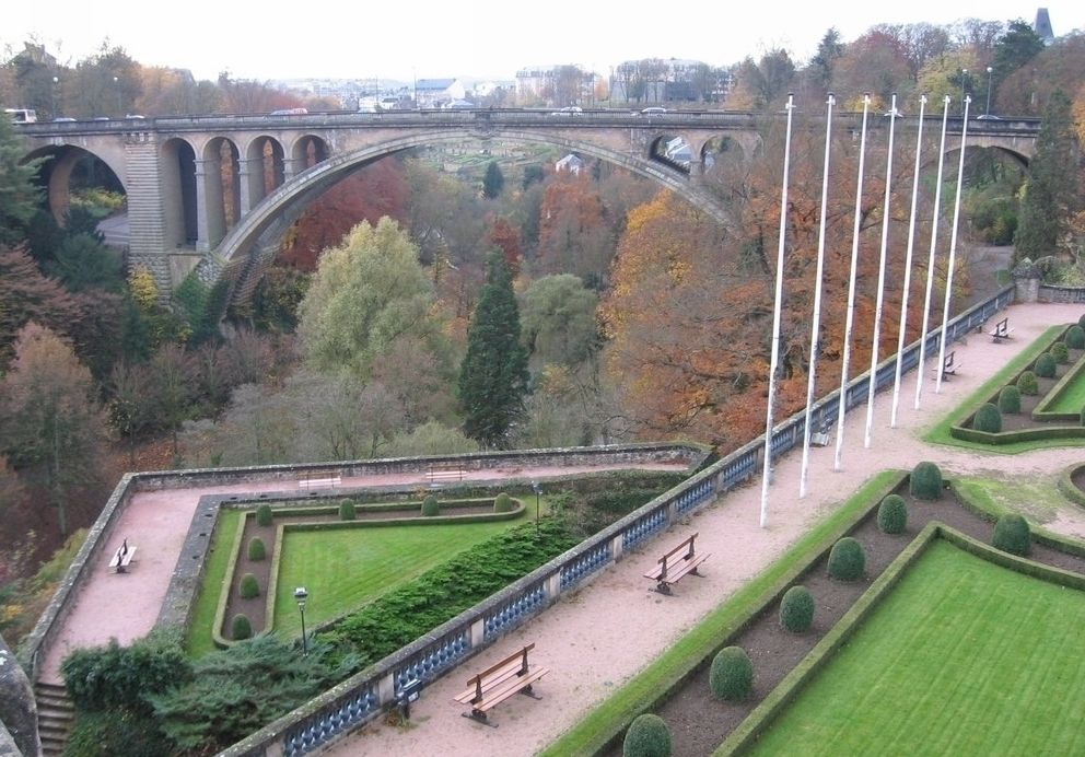 阿道夫大橋 阿道夫大橋作為歐洲地區杰出建筑物之一,也是盧森堡的市標之一的“阿道夫大橋”建于十九世紀末至二十世紀初,是一座由石頭砌成橫跨盧森堡大峽谷的高架橋,此橋高46米、長84米,且支撐橋梁的拱門成左右對稱顯得十分壯觀。該橋連接了盧森堡的新、舊兩市區,游客可以從橋上眺望遠處的美麗風景。