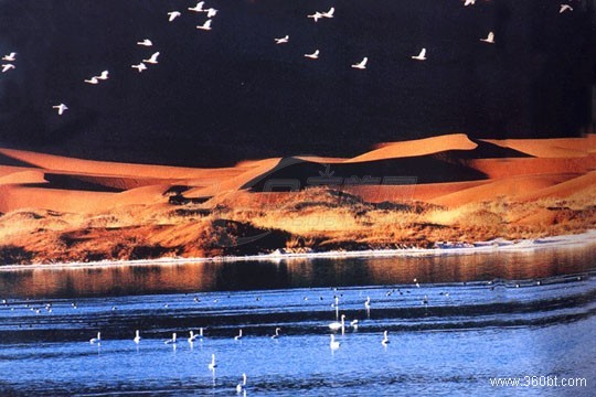這里群沙懷抱,沙峰林立、起伏錯落、一望無垠,金燦燦、亮閃閃,如大海波濤從四周漫卷而來,卻突然如著了魔法一般被茵茵綠草、汪汪湖泊鎖定,形成了方圓近百里的沙漠濕地草原。在茫茫無涯的翰海中,這不能不說不是一個奇跡!況且這里還是古絲綢之路北路要塞,古商道、古鹽道、大盛魁古駝道……;還有古長城、古戰場、古買賣城遺址,流傳千古的故事和傳說以及世世代代在馬背上繁衍生長、與草原休戚與共的沙漠牧民,因此,被譽為“大漠中的伊甸園”名副其實。
