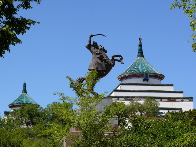 成吉思汗廟坐落在興安盟烏蘭浩特市罕山之巔,始建成于1940年,這座融漢、蒙、藏三個民族建筑風格于一體的廟宇,從正面看是"山"字形。正殿當中有16根粗大的紅漆明柱,四周繪有反映成吉思汗業績的精美圖案,中央為2.8米高的成吉思汗銅像;兩偏殿陳列有元代的兵器,服裝,瓷器等復制品,山門到正殿有寬10米、長158米用花崗巖砌成的81級臺階。