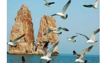 萬鳥島又稱車由島,坐落于長島諸島中部偏東,這個(gè)海拔73.5米、僅有0.05平方公里的小島,在浩渺的汪洋大海之中,簡直是一粒微不足道的沙粒,然而海深魅力大,島小情趣多,島上棲居著上萬只海鷗,被稱為“萬鳥島”。萬鳥島,又稱車由島,遠(yuǎn)遠(yuǎn)望去,酷似一艘錨泊的登陸艦。全島海岸線長1.25公里,海岸地貌懸崖陡壁占90%以上,這些如劈如削的斷崖,多石英巖與極巖,破碎性強(qiáng),經(jīng)風(fēng)化和海蝕,崖壁此凸彼凹,石階、石臺(tái)、石窟、石穴鱗次櫛比,形成一座自然的海鷗“石樓”。