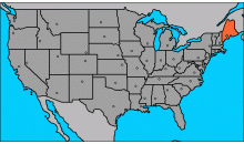 緬因州 (Maine -- ME)美國東北部新英格蘭地區一州。西北和東北邊境分別毗鄰加拿大,南臨大西洋 ,西接新罕布什爾州 。面積 8.6 萬平方千米,人口123.3萬(1990)。首府奧古斯塔 。地形主體為新英格蘭高地,地面波狀起伏,海拔 600 米左右,中部卡塔丁山海拔1606米,為全州最高峰。西北部為崎嶇的懷特山區,東南部多狹窄的局部沿海低地,海岸曲折,多港灣,岸外小島棋布。